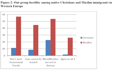 O quadro acima mostra que 58% dos muçulmanos na Europa não querem amigos homossexuais (enquanto por volta de 10% dos cristãos não querem), 45% dos muçulmanos na Europa acham que não se pode confiar em judeus (menos de 10% dos cristãos concordam), e 54% dos imigrantes muçulmanos acreditam que o Ocidente quer destruir a cultura muçulmana (enquanto 23% dos cristãos acham que os muçulmanos querem destruir a cultura ocidental).